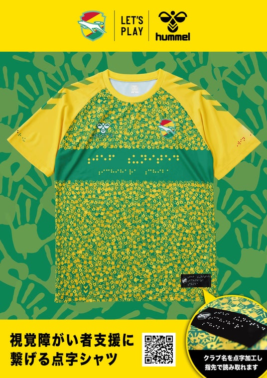 点字シャツのデザインは、たくさんの応援する手のひらを重ね、スタジアムに喜びをつくり出す様子を全面にプリントし、重なった手のひらが千葉県の県花「菜の花」としてスタジアムに広がる様子をイメージ。また、シャツの裾部にはクラブ名を点字加工で施し、浮き出た文字を指先で触って読み取れるようにしています。