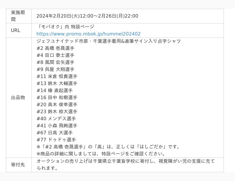 【ジェフユナイテッド市原・千葉 hummel点字シャツチャリティーオークション概要】