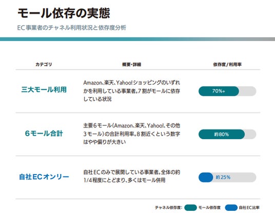 価格勝負が激しさを増しています。多くの事業者がモールECに売上の大半を占める中、今後もモールと自社ECの併用が主流となる見通しですが、ここで課題となるのが