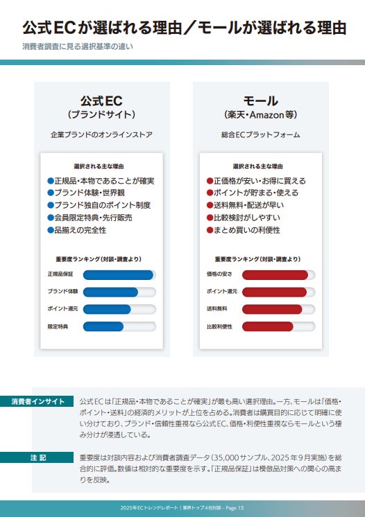 モールECと自社ECの最適な役割分担と、モールECと自社ECに対して消費者が求めているポイントを徹底解説。モールECは“出会いの場”や“購入の利便性”を担い、 自社ECは“ブランド体験の提供”や “顧客との関係性構築”を担う―― このように目的を分けて設計することで、 価格競争に依存しない販売戦略を叶えることができます。