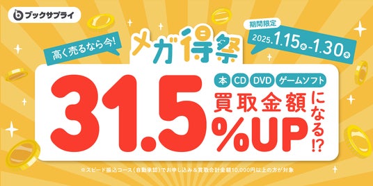 株式会社ブックサプライ(本社:大阪府吹田市、代表取締役:藪田真吾)は、「メガ得祭り」と題して、特別な買取キャンペーンを期間限定で開催いたします。本キャンペーンは、2025年1月15日(水)から2025年1月30日(木)まで実施され、買取対象全アイテムの買取金額が通常より