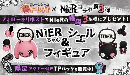 2024年10月30日(水)よりアパレルブランド『NIER CLOTHING』との第3弾コラボプライズとして『NIER CLOTHING』の人気マスコットキャラクターNIERちゃんとシエルのフィギュア2種がトレバに登場します。