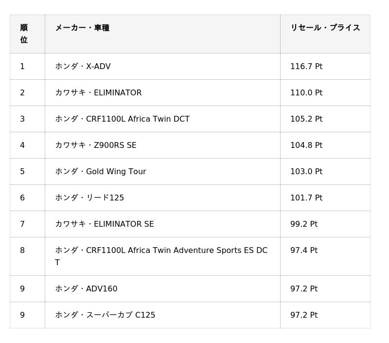 https://www.8190.jp/bikelifelab/bikefuture/resale-ranking/『リセール・プライス』とは バイクを再び売却(=リセール)するときの価格(=プライス)を指します。