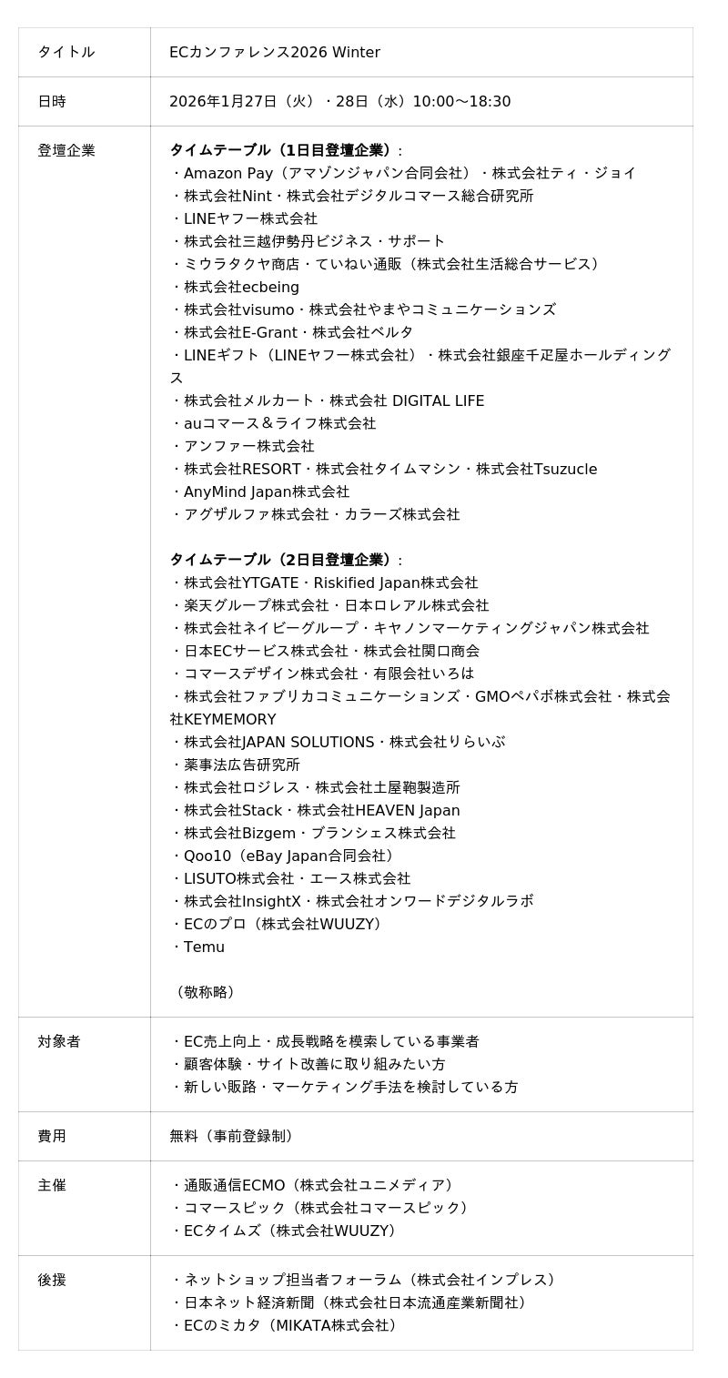 株式会社ユニメディア株式会社ユニメディア(本社:東京都千代田区、代表取締役社長:末田 真、以下「当社」)が運営する「通販通信ECMO」は、2026年1月27日(火)・28日(水)に「ECカンファレンス2026 Winter」をオンラインにて開催いたします。本セミナーは、「通販通信ECMO」、「コマースピック」、「ECタイムズ」、「ネットショップ担当者フォーラム」、「日本ネット経済新聞」、「ECのミカタ」など、EC通販メディアの協力による大規模なセミナーです。2日間にわたり、EC業界のトップリーダーによる貴重な知見を提供いたします。