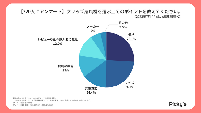 クリップ扇風機を選ぶポイントとして、一番多かった回答は「価格」、次に「サイズ」「充電方式」が続く形となりました。