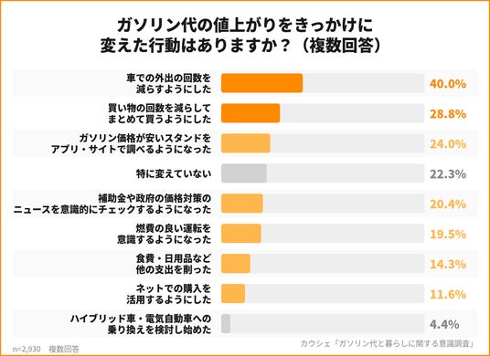 株式会社カウシェガソリン高騰が日常消費を直撃。4割が外出を減らし、3割がまとめ買いにシフト