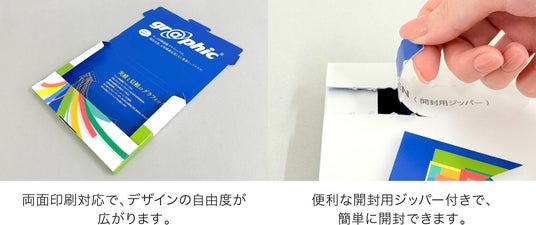 メール便ケースは、両面印刷対応と便利な開封用ジッパー付き