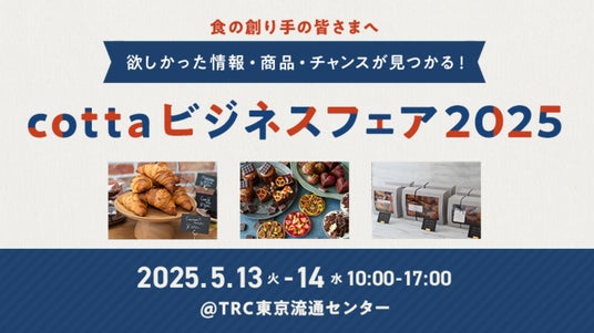 製菓・製パン材料やレシピなど、2万点以上の商品を取り扱う日本最大級のECサイト「cotta」を運営する株式会社cotta(本社:大分県津久見市、代表取締役社長:黒須 綾希子)は、2025年5月13日(火)・14日(水)の2日間、初のBtoB向け大規模展示会 「cottaビジネスフェア2025」 を開催いたします。