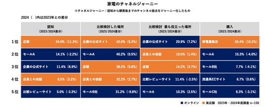 ■本調査結果の各項目について1.リスクヘッジ購買が顕著な「家電」 先述の通り、電化製品カテゴリーでは、オンラインと実店舗を行き来して検討した上で購入する傾向が強まりました。特に家電に関しては、認知・比較検討・購入の主要チャネルを考慮すると店舗購入が昨年比15.2pt増加しています。購買プロセスでは、公式サイトを中心にオンラインで事前に情報を収集し、最終的に店頭で実物を確認して購入するという行動が見られます。(図5)