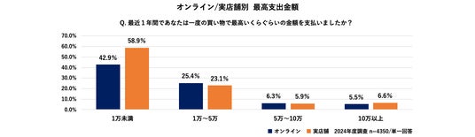 2.高価格帯の商品購入におけるオンラインと実店舗の利用の差は少ない 本年度の調査では、1万円未満の購入は実店舗が多く、1~5万円の価格帯ではオンライン決済が増える傾向が見られました。5万円以上については、オンラインと実店舗での利用に大きな差はなく、高価格帯の商品購入における選択基準に両者の違いがほとんどないことが明らかになりました。オンラインでの決済額は今後も増加する可能性があり、注視が必要です。(図2)