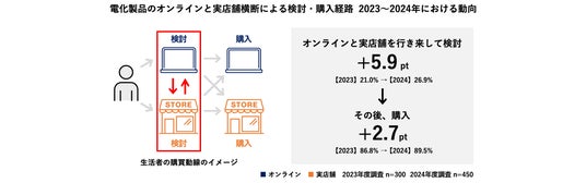 3.検討要素の多い商品はオンラインと実店舗の両方で情報収集をしたうえで購買 検討要素の多い商品に関しては、生活者がオンラインと実店舗を行き来しながら慎重に購買する傾向が再び確認されています。例えば、電化製品では、オンラインと実店舗を行き来する生活者が5.9pt増加し、検討を経て購入する割合も2.7pt増加しました。これは、商品スペックや詳細情報を把握した上で実物を確認することで購買リスクを軽減したいという生活者のニーズが読み取れます。(図3)