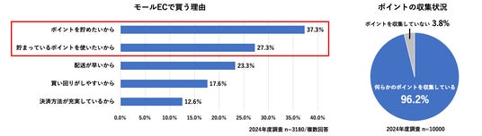3.リスクヘッジ購買におけるモールECとポイント 公式サイトの活用が増加している一方で、モールECも引き続き主要な購買チャネルとして重要な役割を果たしています。その理由として、「ポイントを貯めたいから」という回答が37.3%、「貯まっているポイントを使いたいから」という回答が27.3%を占めており、依然としてポイントに基づく購買行動が根強く続いていることが伺えます。さらに、96.2%の生活者が何らかのポイントを集めており、ポイントを意識した購買行動が続いています。(図9)