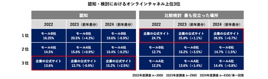 2.企業の公式サイトの役割本調査によると、生活者が情報収集の際に「企業の公式サイト」を利用する頻度が増加していることが明らかになり、2022年と比較して、認知が1.6pt、検討(最も役に立ったチャネル)が1.8ptと「企業の公式サイト」利用が伸長しています。(図7)