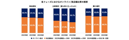 ■本調査結果の考察1.購買行動におけるデジタルシフトが継続 コロナ禍による行動制限が解かれ、生活者の日常が戻った現在でも、購買行動全体においてデジタルシフトの傾向は続いています。特に、比較検討フェーズでは、オンラインチャネルを利用する生活者が2022年の50.0%から2023年には52.2%、2024年には55.7%と、2年間で5.7pt 増加しました。(図1)