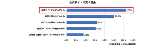 公式サイトで購入する理由として最も多かったのは「公式サイトだと安心だから(12.5%)」です。生活者は、公式サイトを通じて確かな商品情報に加えて、安全性や信頼性を求めており、ここでもリスクヘッジ購買の傾向が見て取れます。(図8)