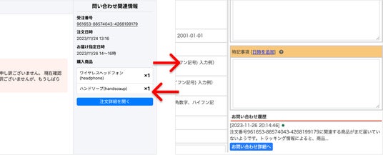 「注文の詳細画面から、お問い合わせの履歴をすぐ確認したい」