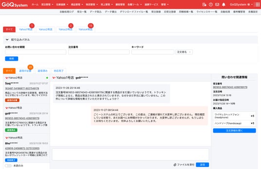 株式会社GoQSystem(本社:東京都中央区、代表:藤本 卓治)が開発・提供する通販一元管理システム『GoQSystem』は、新機能である「お問い合わせ管理」のβ版を2023年12月26日(火)よりリリースいたします。「お問い合わせ管理」とは、Yahoo!ショッピングなど各モールに寄せられるお客様からのお問い合わせをGoQSystem内で確認し、回答できるようにする機能です。また、本機能ではただお問い合わせに回答するばかりでなく、お問い合わせしたお客様の注文情報を即座に表示させることも可能です。そのため、長い時間を要した確認作業の時間を大幅に削減することができます。本機能は、有料オプションである「APIオプション」をご契約中の店舗様のみ無料でご利用いただけます。オプション未契約の店舗様であっても、20日間無料でお試ししていただくことが可能です。多忙極まる年末年始の商戦で、お客様からのお問い合わせ対応に負担を感じている店舗様は、ぜひ本機能をご活用ください。お問い合わせはこちら