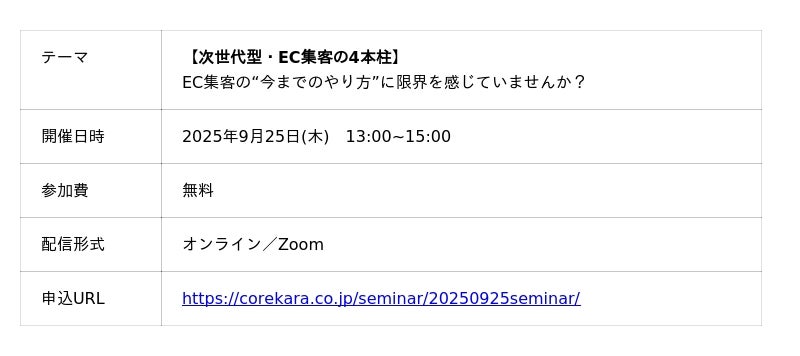 【次世代型・EC集客の4本柱】と題し、広告・SEO・PR・SNSの最前線を走る4社が集結し、明日から“成果が変わる”実践ノウハウを余すことなく解説します。