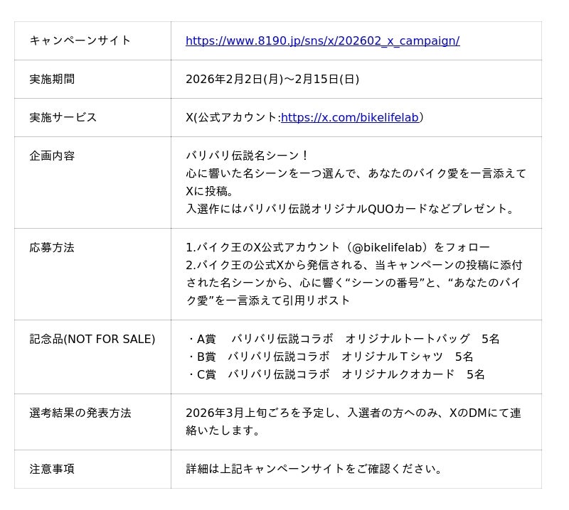 ■バリバリ伝説の限定特典グッズがもらえる、SNSキャンペーンも実施!OOHおよびCM展開と連動し、SNSキャンペーンを実施します。キャンペーンでは、「自身にとってバイクとは何か」「バイクに伝えたい想い」など、バイクへの愛情を言葉にして投稿していただくことを参加条件としています。