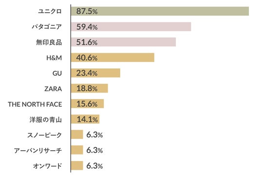 ▼リサイクルを行うブランドで認知度が高いのは「ユニクロ」「パタゴニア」「無印良品」近年はアパレルブランドでリサイクルを行うところが増えてきました。そこで、洋服のリサイクルを行っているブランドで知っているところについて聞いてみました。
