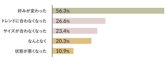 一番多かったのは、「好みが変わった」で56.3%の方がこの回答を選びました。次いで「トレンドに合わなくなった」(26.6%)、「サイズが合わなくなった」(23.4%)でした。「なんとなく」という答えも、およそ5人に1人が答えています。