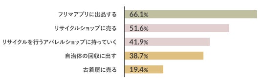 もっとも利用している人が多かったのが「フリマアプリに出品する」で66.1%でした。また「リサイクルショップに売る」(51.6%)も人気。ほかには「リサイクルを行うアパレルショップに持っていく」(41.9%)、「自治体の回収に出す」(38.7%)もあり、さまざまな選択肢を利用していることがわかりました。