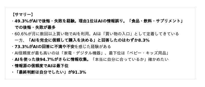 49.3%がAIで後悔・失敗を経験。理由1位はAIの情報誤り。「食品・飲料・サプリメント」での後悔・失敗が最多。49.3%がAIで選んで購入後に後悔・失敗した経験があると回答しました。理由1位は「AIが推薦した商品の情報自体が間違っていた(33.1%)」という結果に。AIは手軽である反面、推薦情報の正確性に課題があることがうかがえます。後悔・失敗したカテゴリは「食品・飲料・サプリメント(18.3%)」が最多で、「家電・デジタル機器(15.0%)」、「日用品・生活雑貨(12.7%)」が続く結果となりました。
