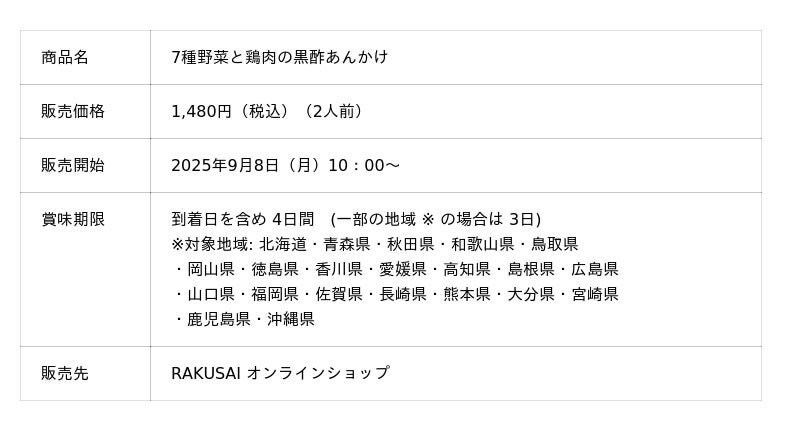 ~たった10分で完成!シャキシャキ、とろっと、ホクホク…食感が楽しい一品~ 楽彩株式会社(本社:東京都足立区/代表取締役社長:大崎善保)は、7種の彩り豊かな野菜と鶏もも肉を、まろやかな酸味とコク深い黒酢あんで絡めた『7種野菜と鶏肉の黒酢あんかけ』を、2025年9月8日(月)10:00より公式オンラインショップにて販売開始いたします。