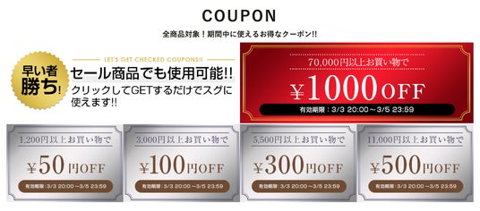 70,000円以上のお買い物で1000円OFF枚数限定超大幅値引きクーポン!-