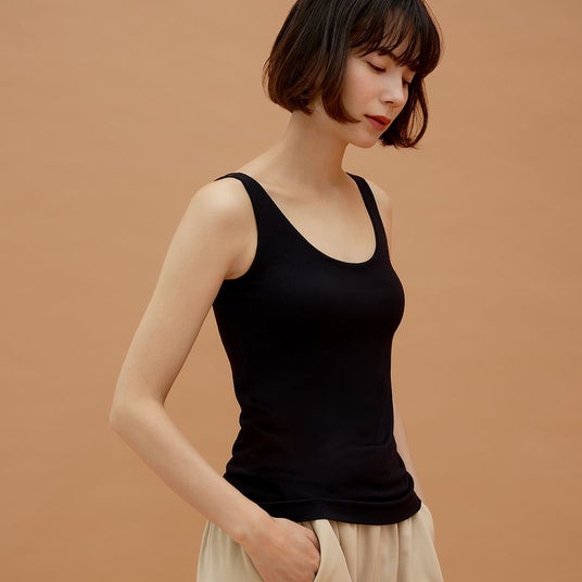 BAMBI WATER ブライン ヒートインナー タンクトップバストを高い位置でキープしながら背中から脇にかけて特許取得(*1) の特殊製法で横流れを防ぐことで、従来のブラトップにカパカパせず胸元も安心。重ね着もしやすく、タンクトップタイプなら袖がないのでスッキリ。