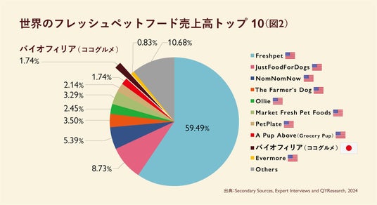 図2のQYResearch社が調査した世界のフレッシュペットフードブランドの売上高トップ10を見ると、世界のフレッシュペットフード市場は欧米が中心でありアメリカ企業が市場を牽引している中で、米国以外で唯一当社が8位にランクインしています。