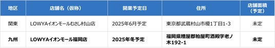 |LOWYA 実店舗出店状況一覧(開業日順)