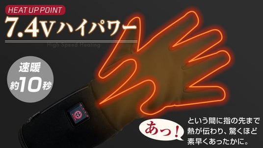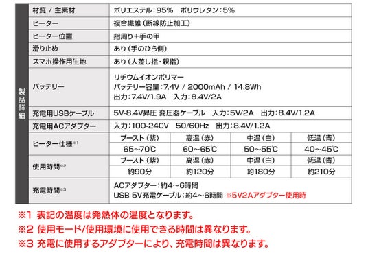 7.4Vタイプを採用した高出力設計により、短時間での温度上昇が可能となり、冷え込みが厳しい環境でも指先までしっかりと温めます。