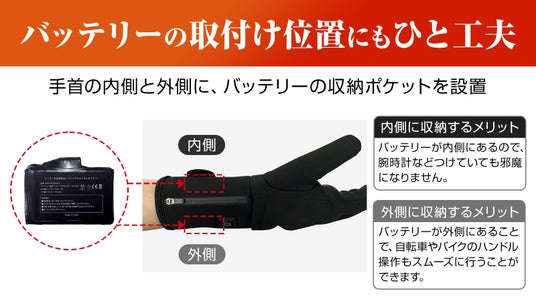 ヒーターグローブ愛用者へのアンケート結果では、バッテリーの設置位置に関する意見は、ほぼ半々でした。そこで、使う人が手を動かしやすいと感じる場所にバッテリーを設置できるよう工夫しました。