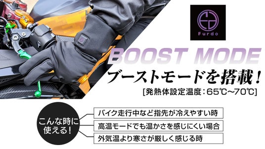 昨年、大ヒットしたFurdoインナーヒーターグローブは今回3代目となり、指先までしっかりと温める機能やブーストモードなどさらに進化させることに成功しました。