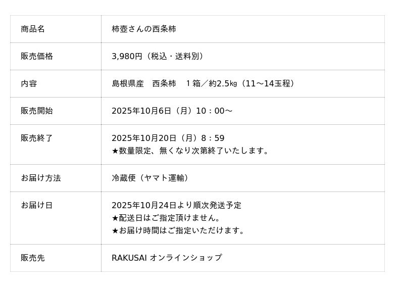 楽彩株式会社(本社:東京都足立区/代表取締役社長:大崎善保)は、知る人ぞ知るブランド柿「柿壺さんの西条柿」を、2025年10月6日(月)10:00より、公式オンラインショップにて期間限定で販売開始いたします。