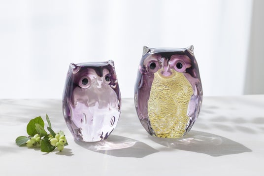 新色『紫暮(しぐれ)』は、約4年ぶりに誕生した赤紫色のガラスです。経験豊かな職人の見守る中、若手職人が調合と試作を重ね、津軽びいどろの色づくりの技術を継承しながら完成させました。夕暮れから夜へと移ろう空を映すような情景を宿した色で、経験と新たな感性が響き合う一色です。親ふくろうには成鳥の羽毛を表す金箔をあしらい、背面に紫暮色を配することで正面から最も深みが映える設計に。新たな門出や長寿祝いなど人生の節目に寄り添い、“福を呼ぶ”ふくろうの縁起と紫色の象徴性を重ね、大切な人への願いを静かに託せる贈りものに仕上がりました。