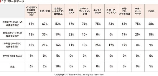 ー 商材カテゴリー別では「アパレル・ファッション小物」の74%が「昨年比で10%以上の成長を目指す」と積極的な回答結果となっています。