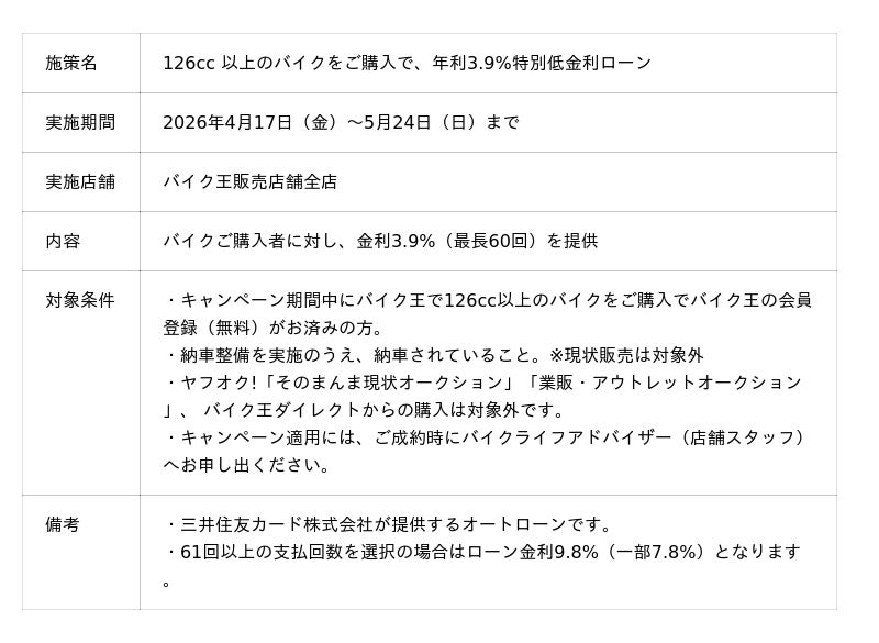 2.126cc以上のバイクをご購入で、年利3.9%特別低金利ローン当社で126cc以上のバイクをご購入いただき、バイク王会員の登録(無料)をされているお客様に、年利 3.9%特別低金利ローンをご提供します。