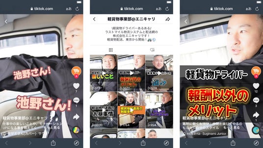 ラストマイルに特化した物流ソリューションを提供する株式会社エニキャリ(以下、当社)は、軽貨物ドライバーあるあるを配信するTikTok公式アカウントを開設しました。このTikTokアカウントでは、軽貨物ドライバーを始めたい人に向けて、報酬形態からランチ事情まで、働き方や環境を知ってもらうために、軽貨物運送事情をよく知る池野さんに様々な問いかけを行い配信しています。「池野さん!池野さん!」で、はじまるやり取りに、少し戸惑いながらも笑顔で丁寧に対応する池野さんのわかりやすい受け答えが楽しめるコンテンツとなっています。
