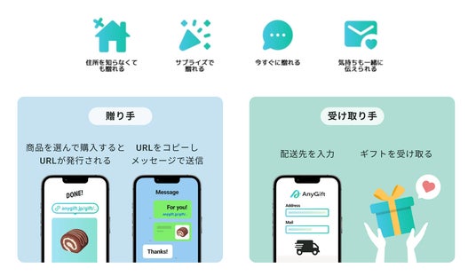 eギフトサービス『AnyGift』についてeギフトは、お届け先の住所を知らなくても、LINEやメールなどでURLを送ることで、ギフトを贈ることができるサービスです。