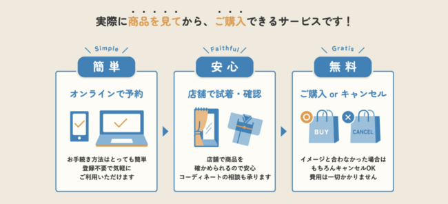 着物通販サイト『リユースセレクトショップ バイセルオンラインストア』で気になる商品を探し、専用のフォームで申し込みすることで、全国4箇所で展開する常設店にて試着・確認いただけます。