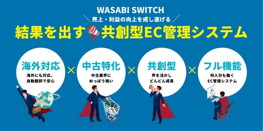 「WASABI SWITCH」は一括出品・受注、買取管理・在庫連携を備えた、簡単に複数モール管理ができる中古品業者特化型ECショップ一元管理システムです。各作業での時間短縮、業務の現状を劇的に改善し効率化することで、ショップの売上・利益の向上を図ります。