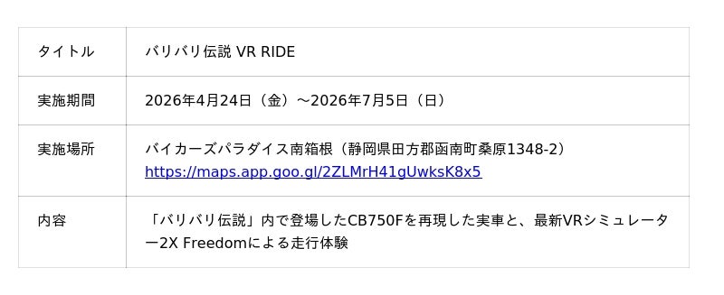「常識を壊し、新たな価値と感動を生む」を企業理念に掲げ、「バイクライフの生涯パートナー」を目指す株式会社バイク王&カンパニー(代表取締役CEO:澤 篤史、本社:東京都世田谷区、証券コード:3377、以下「当社」)は、2026年4月24日(金)から7月5日(日)まで、静岡県函南町の「バイカーズパラダイス南箱根」にて、人気漫画「バリバリ伝説」を再現したCB750Fの実車と、最新のVRシミュレーターを融合した体験型展示「バリバリ伝説 VR RIDE」を実施します。
