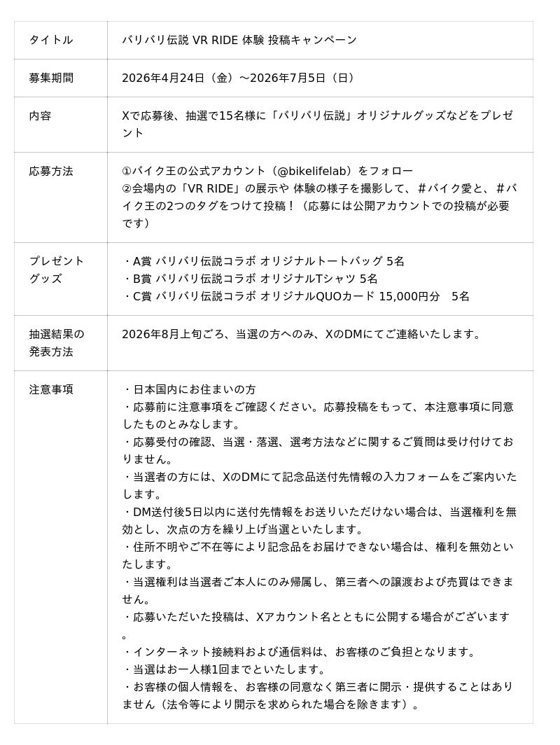■同時開催!SNS投稿キャンペーン会場での本展示や、体験の様子をXに投稿いただいた方の中から抽選で、バリバリ伝説とのコラボグッズを進呈いたします。ライダーのみならず幅広い方々に楽しんでいただける企画となっておりますので、ぜひご参加ください。
