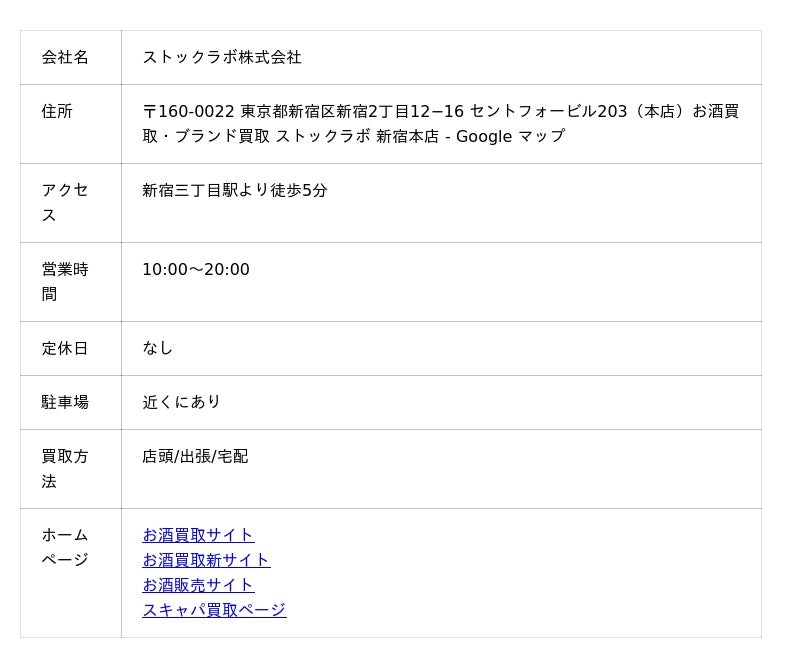 お酒買取専門店ストックラボのスキャパ買取の特徴を3つに分けて解説します。まずは、ストックラボの業者の概要をご確認ください。