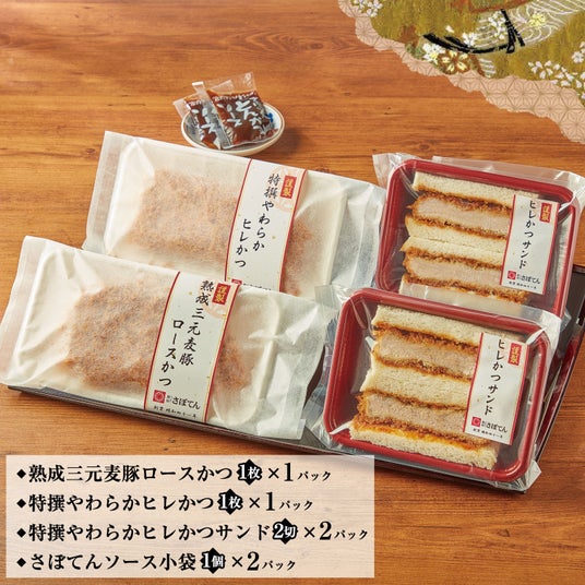 ◇セット内容:熟成三元麦豚ロースかつ1枚×1パック、特撰やわらかヒレかつ1枚×1パック、特撰やわらかヒレかつサンド2切×2パック、小袋ソース2袋