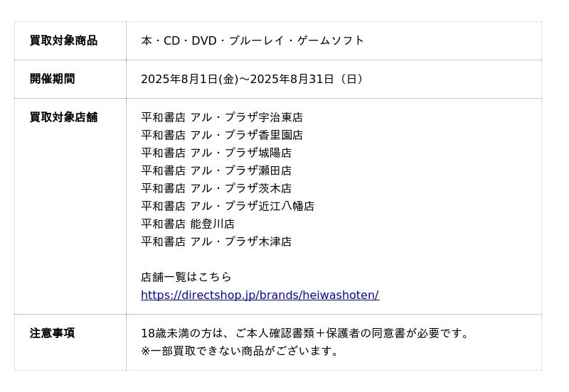 株式会社ブックサプライ(本社:大阪府吹田市、代表:藪田真吾)が提供する買取システムを利用し、株式会社ダイレクト・ショップ(本社:滋賀県彦根市、代表取締役社長:松澤恒雄)が運営する平和書店の計8店舗で、2025年8月1日(金)から2025年8月31日(日)までの期間限定で「買取金額10%UPキャンペーン」を実施いたします。