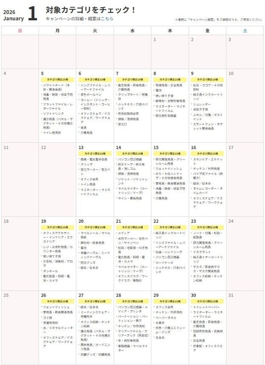 コクヨグループでEコマースサービスを提供する株式会社カウネット(本社:東京都港区/代表取締役社長:宮澤典友、以下「カウネット」)は、ECサイト「カウネット」において、お客様の計画的なお買い物をサポートする施策として、「カウ得!ポイントUPカレンダー」を公開、2026年1月5日(月)より、対象カテゴリのポイントが15倍となる特典をご提供します。
