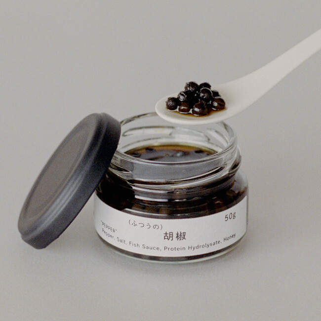目指したのは、そのまま食べてもおいしいほどやさしい生胡椒の開発です。カタクチイワシを食塩に漬け込み、自然落下した液体のみを丁寧に抽出して魚醤(コラトゥーラ)を仕上げ、そこに黒胡椒を漬け込みます。さらにハチミツを垂らし、漬け込んだうま味を伸ばし、辛味の角だけをとっていきます。この二重の漬け込みと隠し味で、何にでも合って飽きの来ない生胡椒がようやく出来上がりました。